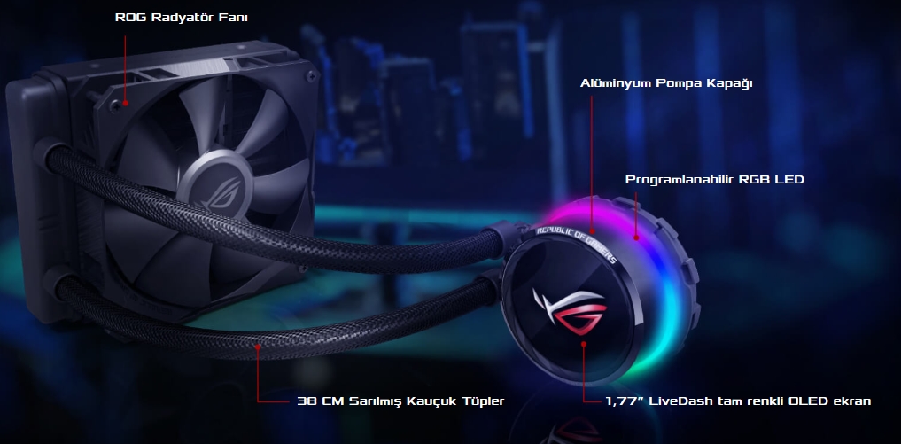 OLED Bildirim Ekranı, Asus Aura SYNC RGB Aydınlatma, 120mm Radyatör, AMD ve Intel İşlemci Desteği