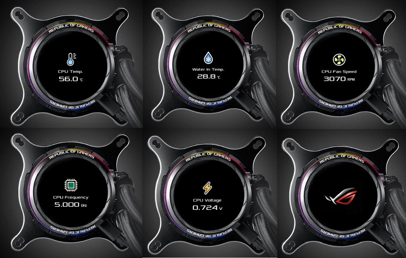 | ROG Ryuo, 1,77 inç LiveDash renkli OLED ekrana sahip ilk AIO soğutucu. LiveDash ekran; sıcaklık, voltaj, fan hızları veya frekanslar gibi yararlı sistem bilgilerini* sunuyor. İsterseniz LiveDash ekranda kendinize özel bir görüntü veya animasyon** da gösterebilirsiniz. Takımınızın logosuna veya oyunlardaki takma adınıza ekranda yer verebilirsiniz. | |