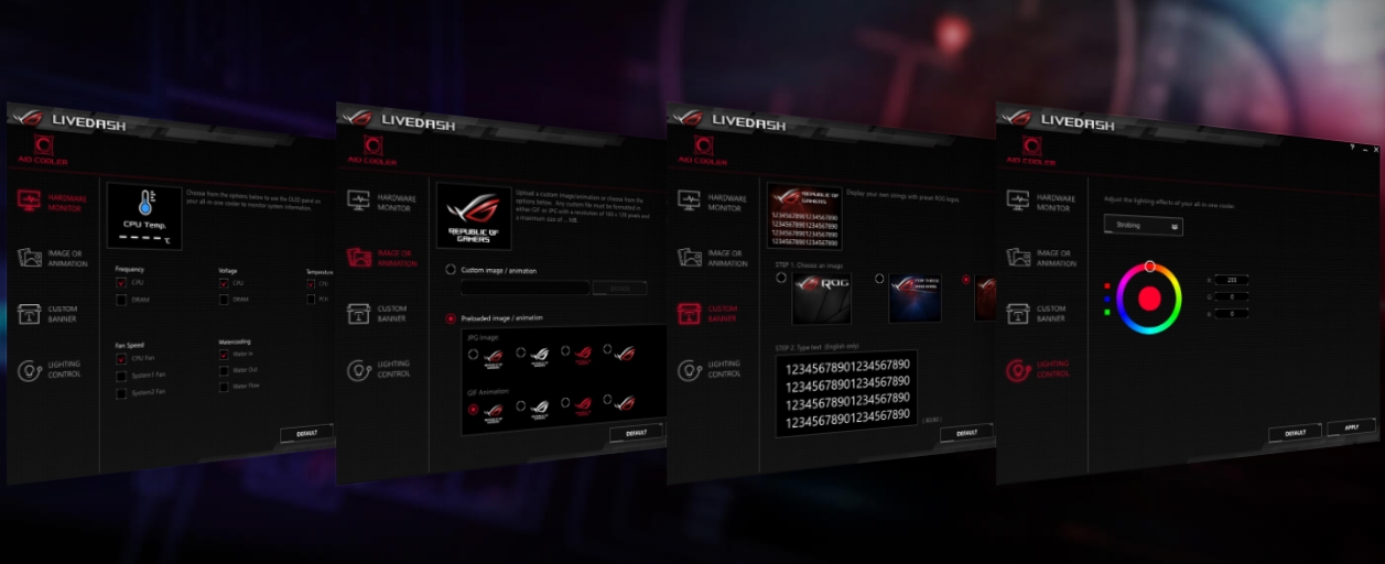 | LiveDash yazılımı ile ROG Ryuo'nun LiveDash OLED ekranını ve RGB aydınlatma efektlerini kolayca ayarlayabilirsiniz. Ayarları yukarıdan aşağıya adım adım dizen kullanışlı arayüz üzerinden hangi sistem verilerini izleyeceğinizi seçin, görüntüleyeceğiniz özel GIF ve görselleri belirleyin, RGB aydınlatmayı kontrol edin. | |